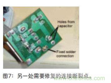 但是后來(lái),我注意到連接器電路板上還有另一處連接斷裂的地方(圖7),于是我把這里也修復(fù)了。出于好玩的心理,我測(cè)量了空載情況下的輸出電壓為5.2V。想想看吧。