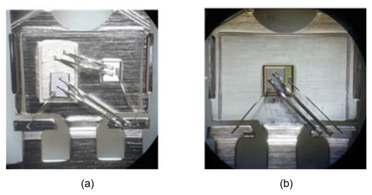 分立cascode 結構采用并排芯片,如圖 2(a)所示,或堆疊芯片,如圖 2(b)所示。在這兩種情況下,SiC JFET 通常都是銀燒結在封裝引線框架上。