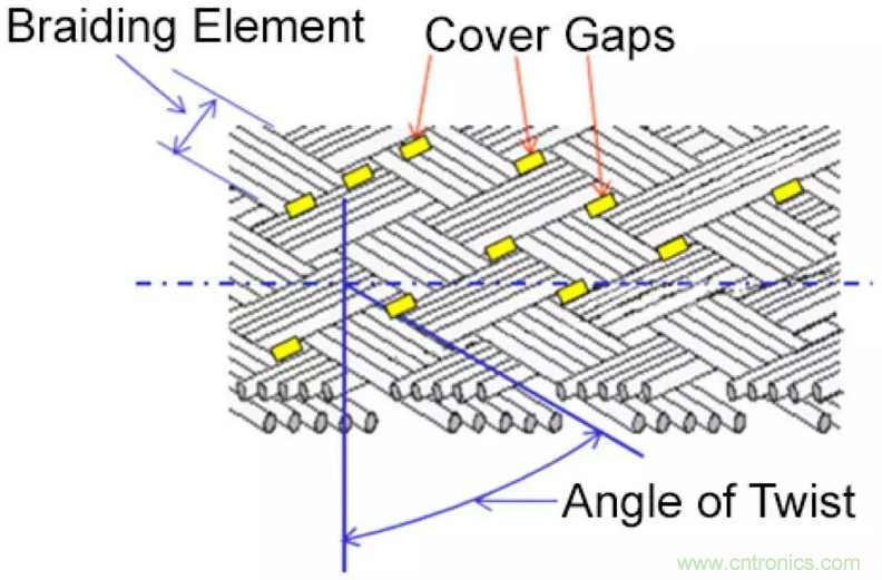 編織網屏蔽并不能提供 100% 的覆蓋率,因為他們在導線表面的覆蓋總會有些細小的縫隙。根據編織的緊密程度,編織網通常能夠提供 70% ~ 95%的覆蓋率。不過一般來說,對于固定敷設的電纜,70% 的屏蔽覆蓋就已經足夠了。