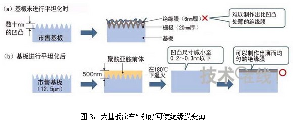 此次染谷等人著眼于容易在硅基板等較為平坦的基板上形成薄而均勻的柵極絕緣層這一點(diǎn),認(rèn)為首先應(yīng)該使柔性基板實(shí)現(xiàn)平坦化。其原因是,“市售柔性基板的表面有數(shù)十nm的凹凸。在上面形成6nm厚的均勻膜比較困難”(染谷)(圖3)。