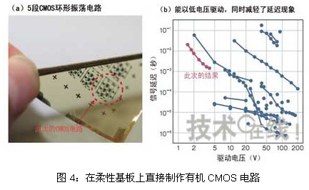 此外,染谷等人還開發(fā)出了多項(xiàng)技術(shù),采用這些技術(shù)可在不到100℃的低溫下完成基板平坦化之后的所有制造工藝。這樣,便可在柔性基板上直接形成有機(jī)CMOS電路。此次制成的5段有機(jī)CMOS環(huán)形振蕩電路,在低電壓驅(qū)動(dòng)的情況下,實(shí)現(xiàn)了每段延遲僅為4.5ms的“全球最快速度”(染谷)(圖 4)。