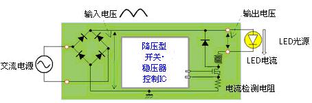 羅姆為了適應(yīng)上述市場需求而在進(jìn)行LED照明用驅(qū)動(dòng)器IC的開發(fā)。為使LED保持一定的亮度點(diǎn)燈,需要有進(jìn)行恒流控制的LED驅(qū)動(dòng)器IC。通常,是從交流電源開始進(jìn)行恒流控制,所以使用降壓型開關(guān)穩(wěn)壓器方式(圖1)。