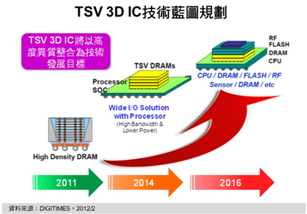 綜合各主要芯片制造商技術(shù)藍圖規(guī)畫,2011年TSV 3D IC是以同質(zhì)整合的高容量DRAM產(chǎn)品為主,至2014年,除將以多顆DRAM堆棧外,尚會整合一顆中央處理器或應(yīng)用處理器的異質(zhì)整合產(chǎn)品。柴煥欣也預(yù)估,要至2016年,才有機會達到將DRAM、RF、NAND Flash、CPU等各種不同的半導體組件以TSV 3D IC技術(shù)整合于同1顆IC之中異質(zhì)整合水平。
