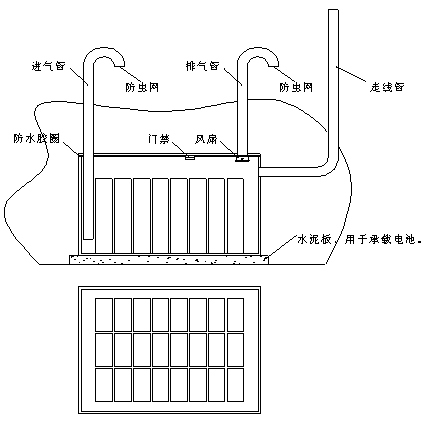 由于電池在試用過程中有少量的氣體溢出,電池箱內(nèi)會有酸氣、潮氣,需要排出。首先通過對進氣管、排氣管的適當排布,可以實現(xiàn)自然呼吸。另外,在排氣管末端安裝風扇,通過一路干接點連接,由開關(guān)電源的獨立監(jiān)控單元控制,每天定時進行10分鐘左右的強制流通,可以徹底排出電池箱內(nèi)的酸氣、潮氣。