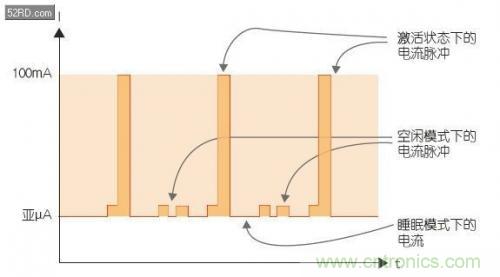 不同的工作模式會(huì)導(dǎo)致電流消耗跨越從亞 uA 到 100mA 很寬的動(dòng)態(tài)范圍,其比值達(dá)到了 1:1,000,000。