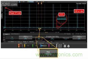通過平移和縮放功能,我們能夠看到電流電平和每個(gè)功率電平的保持時(shí)間。使用傳統(tǒng)測(cè)量工具無法看到的細(xì)節(jié)現(xiàn)在能夠一覽無遺并進(jìn)行測(cè)量。圖 4 中使用“???”確定的后沿脈沖便是一個(gè)明顯示例。軟件揭開了這個(gè)令人意外的秘密:對(duì)于 3.3μA 的平均電流,器件在大約 90μA 峰值處消耗脈沖能量,持續(xù)時(shí)間為 500ms。將這個(gè)電流消耗與 599nA 睡眠電流相加,結(jié)果達(dá)到了 730nA,這比我們預(yù)期的電流高 22%。這種意外可能是造成我們低估能量要求,使電池供電時(shí)間短于預(yù)期的原因之一。