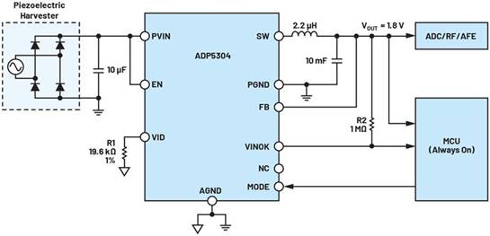 另一種能夠由壓電電源供電的器件是 ADP5304,它以極低的靜態(tài)電流(無負(fù)載時(shí)典型值為 260 nA)工作,非常適合低功耗能量收集應(yīng)用。該數(shù)據(jù)表共享一個(gè)典型的能量收集應(yīng)用電路(見圖 7),由壓電電源供電并用于為 ADC 或 RF IC 供電。