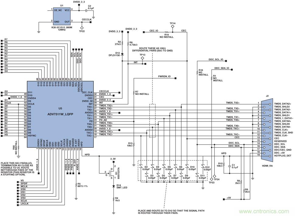 圖6和圖7分別顯示VGA2HDMI轉(zhuǎn)換器的重要部件——視頻數(shù)字化儀(AD9983A)和HDMI Tx (ADV7513)的示例原理圖。不包括MCU電路。