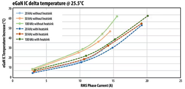 圖 2:GaN 功率級在 25.5°C 環(huán)境溫度和不同 PWM 頻率下的溫升與相電流的關(guān)系。(圖片來源:EPC)