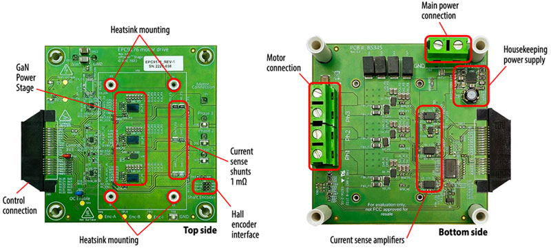 該三相 GaN 逆變器在 14 至 65 VDC 的輸入電壓下工作,切換時不會過沖,因此轉(zhuǎn)矩平穩(wěn),運(yùn)行噪聲極小。該板針對低于 10 V/ns 的 GaN 典型高速開關(guān)斜坡進(jìn)行了優(yōu)化,并且可以選擇降低此開關(guān)斜坡以操作 DC/DC 轉(zhuǎn)換器。此外,還可以連接兩個以不同電平工作的轉(zhuǎn)子位置傳感器(霍爾傳感器)。