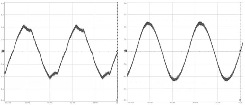 圖 4:500 ns 的空載時間和 40 kHz 的 PWM 頻率(左)(MOSFET 的典型情況)造成相電流發(fā)生高失真,導(dǎo)致高轉(zhuǎn)矩紋波和高噪聲級。當(dāng)空載時間為 50 ns 時(右),得到一個正弦相電流,使得電機(jī)以低噪聲平穩(wěn)運(yùn)轉(zhuǎn)。(圖片來源:EPC)
