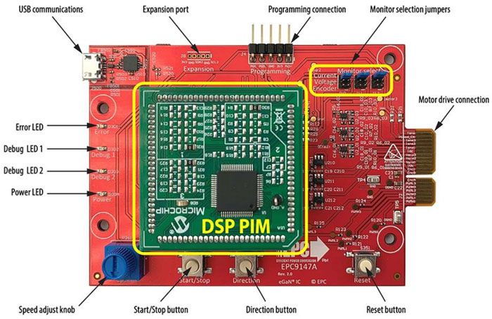 不必編程就能評估 EPC9176 GaN 逆變器板的最快速方法是使用 EPC9147A 控制器接口板。插件模塊 (PIM) MA330031-2 包含 Microchip Technology 的 16 位 DSP dsPIC33EP256MC506-I-PT(圖 5)。