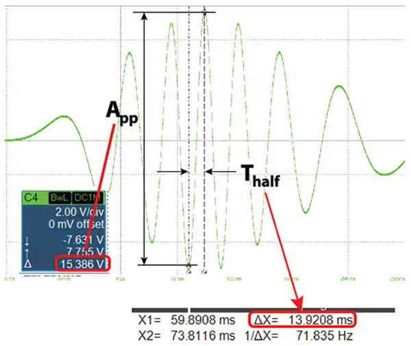 · 測量最大正弦半波的峰間電壓 App 和周期 Thalf(圖 6)。
