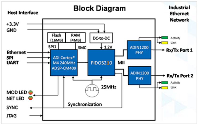 下圖(圖7)為ADIN2299模塊的原理框圖,ADIN2299模塊在前文所述方案的基礎(chǔ)上,將主控MCU采用為ADI自主的ADSP-CM409產(chǎn)品,并配套了系統(tǒng)電源方案。該產(chǎn)品是一款已經(jīng)過全面測試的預(yù)認(rèn)證模塊。模塊搭配了全面的軟件支持,提供API庫用于快速系統(tǒng)集成??蛻粼谶M(jìn)行使用時(shí),需搭配主控處理器,并通過SPI、UART或以太網(wǎng)接口進(jìn)行參數(shù)配置和數(shù)據(jù)交互。ADI搭配該模塊提供的軟件包含了協(xié)議棧、底層硬件驅(qū)動(dòng)、文件系統(tǒng)、數(shù)據(jù)安全固件、WEB服務(wù)等。