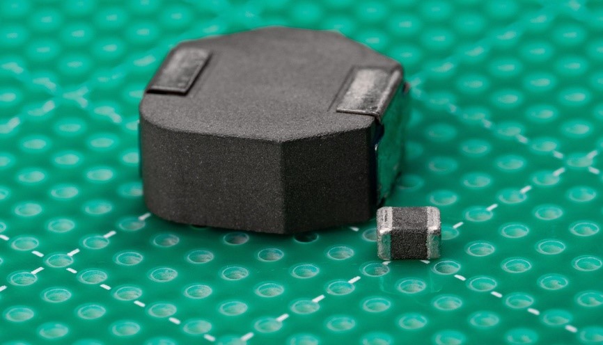 圖 1:8.2μH 電感器 (400kHz) 和超小型 3.3μH 電感器 (2.1MHz) 的尺寸比較