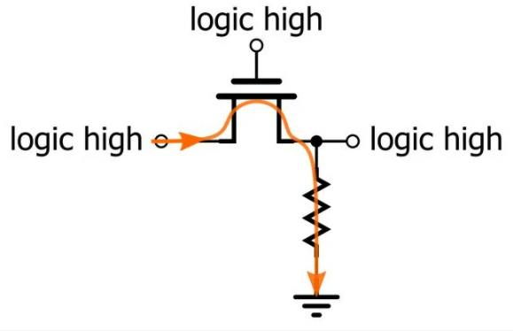 這個問題的基本答案是,邏輯高表示電源軌上的電壓,代表二進(jìn)制 1,邏輯低表示地電壓,代表二進(jìn)制 0。這個描述是一個很好的起點(diǎn),它變得更如果我們說“靠近電源軌”和“靠近地”而不是“在電源軌處”和“在地”,那么是準(zhǔn)確的。此修改考慮了流過 NMOS 或 PMOS 溝道的電流在源極和漏極之間產(chǎn)生小電壓差的事實(shí)。