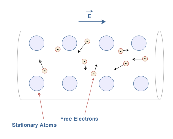 圖8顯示了導(dǎo)體的原子結(jié)構(gòu)的一個簡單模型,其中導(dǎo)體中的電場E導(dǎo)致電子沿與施加的電場相反的方向漂移,而在某些碰撞與固定原子的碰撞后,電子場的 漂移速度 V d。