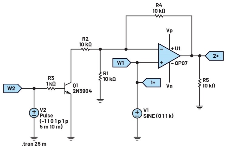 將第一個波形發(fā)生器用作VIN源,向電路提供幅度為2 V峰峰值的1 kHz正弦波激勵。使用第二個波形發(fā)生器控制晶體管,提供幅度為2 V的1 Hz方波激勵。向運算放大器提供±5 V電源電壓。配置示波器,使通道1上顯示輸入信號,通道2上顯示輸出信號。參見圖3。