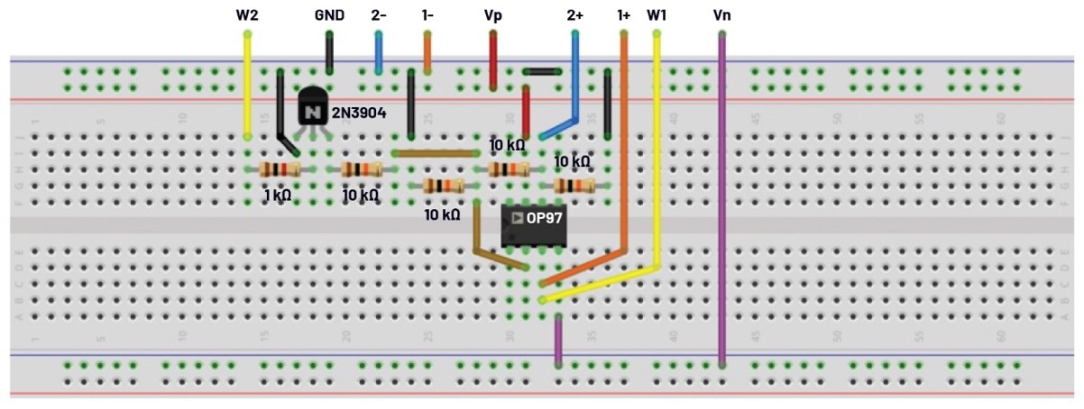 為使用晶體管的壓控放大器構(gòu)建以下試驗板電路(圖2)。