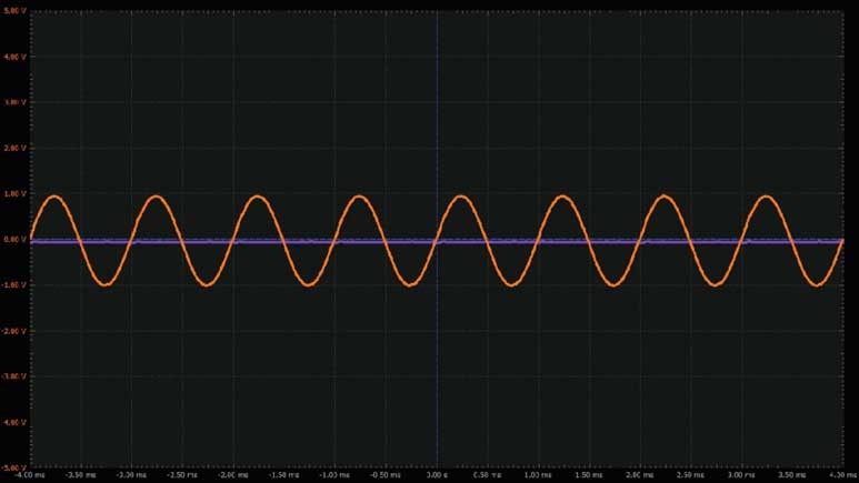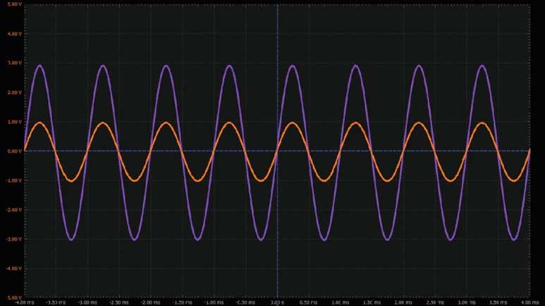 將第一個波形發(fā)生器用作VIN源,向電路提供幅度為2 V峰峰值的1 kHz正弦波激勵。向運算放大器提供±5 V電源電壓。配置示波器,使通道1上顯示輸入信號,通道2上顯示輸出信號。參見圖6。