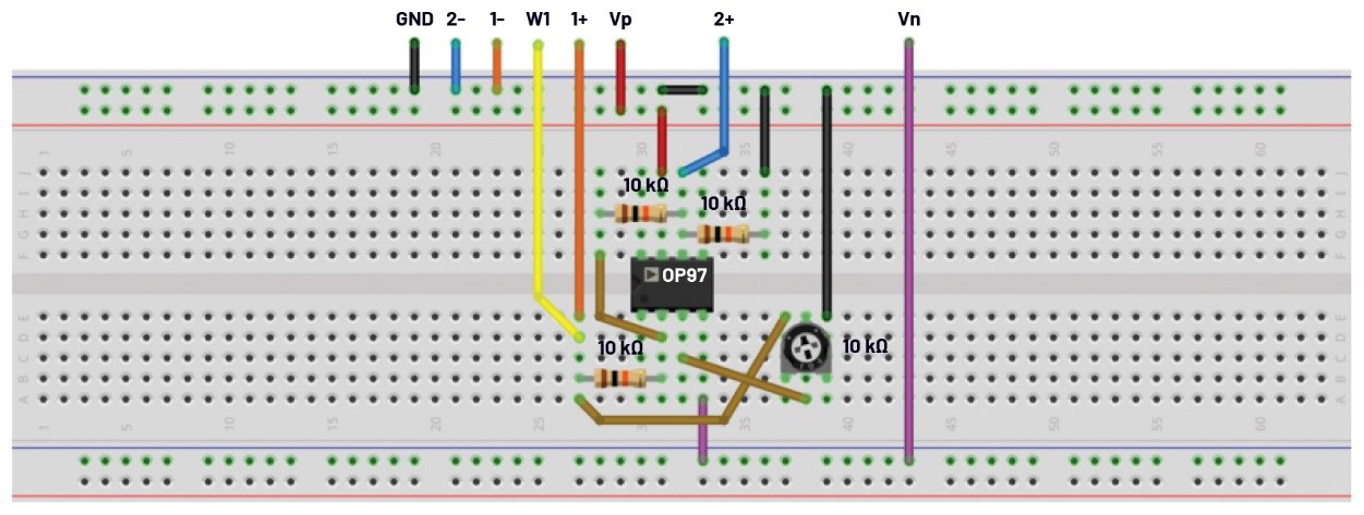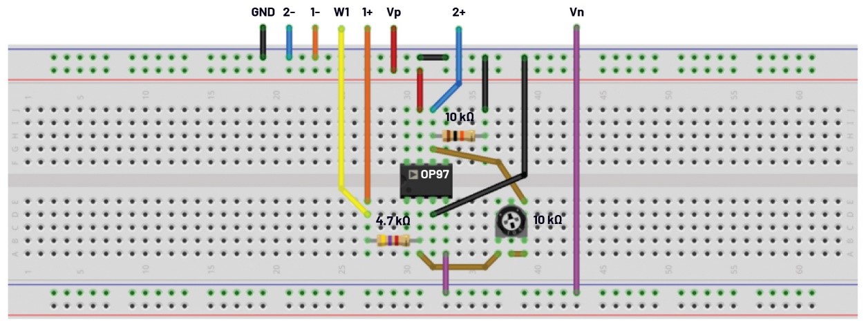 圖5.使用電位計的可變增益反相放大器的試驗板電路