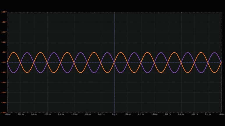 將第一個波形發(fā)生器用作VIN源,向電路提供幅度為2 V峰峰值的1 kHz正弦波激勵。向運算放大器提供±5 V電源電壓。配置示波器,使通道1上顯示輸入信號,通道2上顯示輸出信號。參見圖9。