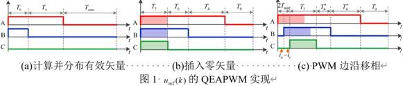 QEAPWM方法核心思想是將三相PWM導(dǎo)通時(shí)刻移到一個(gè)邊沿,并重新分布零矢量。QEAPWM的有效矢量計(jì)算與分布,零矢量的插入,PWM邊沿移相,分別如圖1 (a)、(b)、(c)所示,將三相PWM波形移至PWM周期的左側(cè),生成QEAPWM。