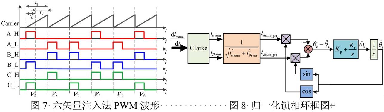 AZVVI通過(guò)注入合成矢量等效為零矢量的六有效矢量,通過(guò)有效矢量激勵(lì)下的電流紋波采樣,實(shí)現(xiàn)轉(zhuǎn)子初始位置和初始速度的估計(jì)與快速帶速重投。圖7所示為注入六個(gè)電壓矢量。圖8為PLL的框圖。