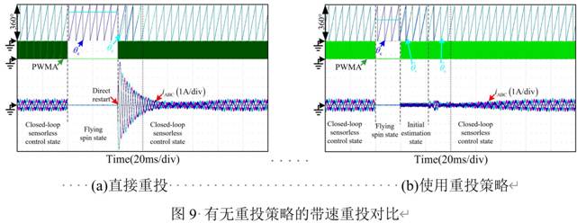 圖9展示是否采用帶速重投策略投切的對(duì)比實(shí)驗(yàn)圖,由于沒(méi)有正確估計(jì)電機(jī)轉(zhuǎn)子位置與轉(zhuǎn)速,直接重投沖擊電流較大,很有可能造成驅(qū)動(dòng)器的損壞。使用AZVVI法后重新切入,驅(qū)動(dòng)器順利重投而無(wú)沖擊電流。
