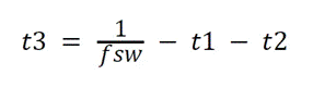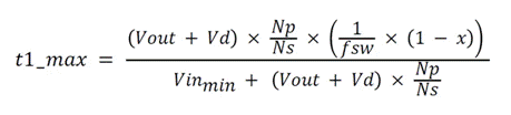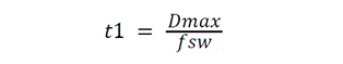 開(kāi)發(fā)人員在開(kāi)始設(shè)計(jì)時(shí)需要了解幾個(gè)關(guān)鍵參數(shù)以及基本電氣規(guī)格。首先選擇開(kāi)關(guān)頻率 (fSW)、所需的最大工作占空比 (Dmax) 和估算的目標(biāo)效率。然后, 方程式 1 按如下方式計(jì)算導(dǎo)通時(shí)間 t1: