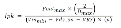 接下來(lái), 使用方程式 2 估算變壓器的峰值初級(jí)電流 Ipk。對(duì)于方程式 2 中的 FET 導(dǎo)通電壓 (Vds_on) 和電流檢測(cè)電阻電壓 (VRS), 假設(shè)一些適合您設(shè)計(jì)的小壓降(如 0.5V)。您可以稍后更新這些壓降。