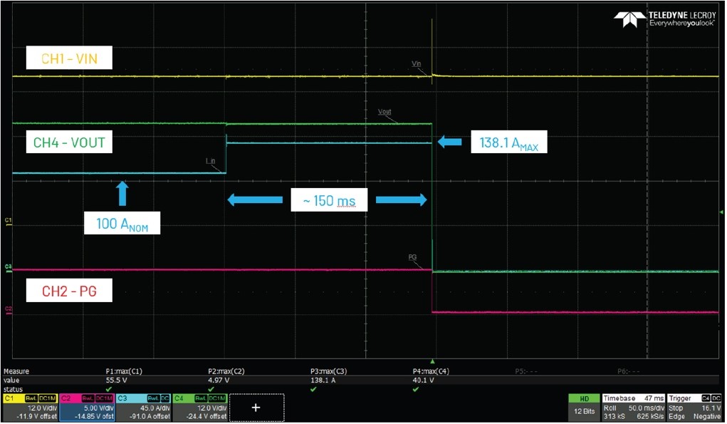 圖5.短路保護(hù)。輸入電壓為40V,負(fù)載電流為100A至130A。
