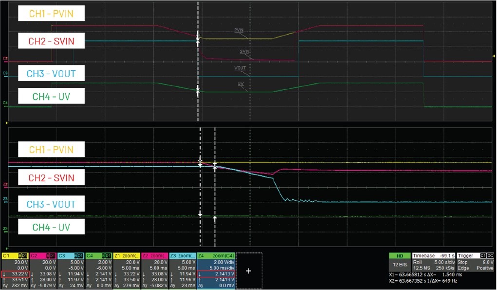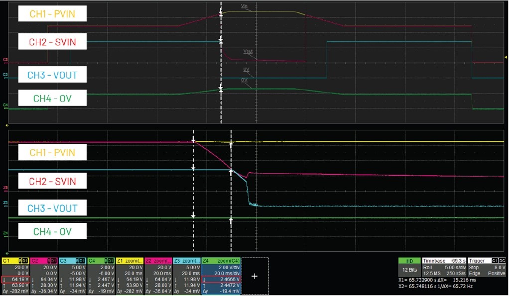 圖7說明了熱插拔控制器的欠壓保護(hù)機(jī)制,當(dāng)UV引腳的電壓低于閾值(測(cè)量值為2.14 V,相當(dāng)于PVIN電壓33 V)時(shí),會(huì)使設(shè)備停止運(yùn)行。圖8則顯示了過壓保護(hù)機(jī)制,當(dāng)OV引腳的電壓超過閾值(測(cè)量值為2.47 V,對(duì)應(yīng)PVIN電壓為64 V)時(shí),會(huì)關(guān)閉設(shè)備。當(dāng)輸入電壓恢復(fù)正常時(shí),控制器會(huì)自動(dòng)重試并恢復(fù)。可以通過修改UV和OV引腳上的電阻分壓器值來調(diào)整閾值。