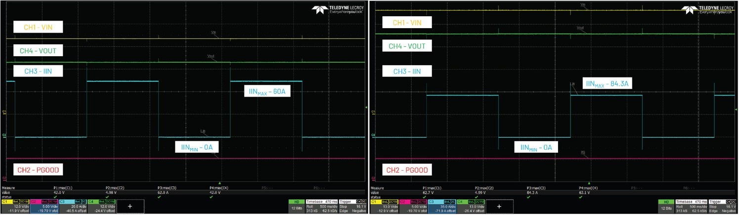 圖9.輸入電壓為40 V和60 V時(shí),2 kW負(fù)載下的負(fù)載瞬態(tài)響應(yīng)。