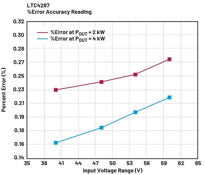 這款熱插拔控制器結(jié)合了高質(zhì)量組件、校準(zhǔn)、溫度補(bǔ)償、降噪、反饋回路和數(shù)字通信功能,實(shí)現(xiàn)了出色的準(zhǔn)確性和精確度。這些特性共同確保了測(cè)量的可靠和一致,有助于提高系統(tǒng)應(yīng)用的整體準(zhǔn)確性和精確度。圖10顯示了LTC4287輸出功率讀數(shù)與測(cè)試設(shè)備測(cè)得的數(shù)據(jù)的比較。