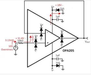 一種用于限制Op-Amp輸入過度電流的常見方法是,在每個電源上只添加輸入電流電阻器和瞬態(tài)電壓抑制器(TVS)二極管(圖2)。電阻器將限制輸入電流,但某些過電壓仍將導(dǎo)向電源。 TVS二極管將保護(hù)電源免受通過ESD二極管引導(dǎo)的過量電壓。