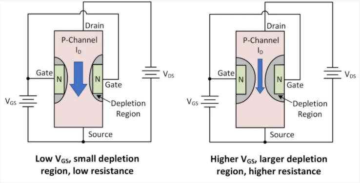 為了了解JFET保護(hù),讓我們回顧一些JFET基本面。該ARICE將重點放在P通道JFET設(shè)備上,但是相同的方法適用于具有極性逆轉(zhuǎn)的N通道設(shè)備。您可以將JFET晶體管視為電壓控制的電阻,其中通道電阻由電壓柵極到源(V GS)和電壓漏極到源(V DS)控制。