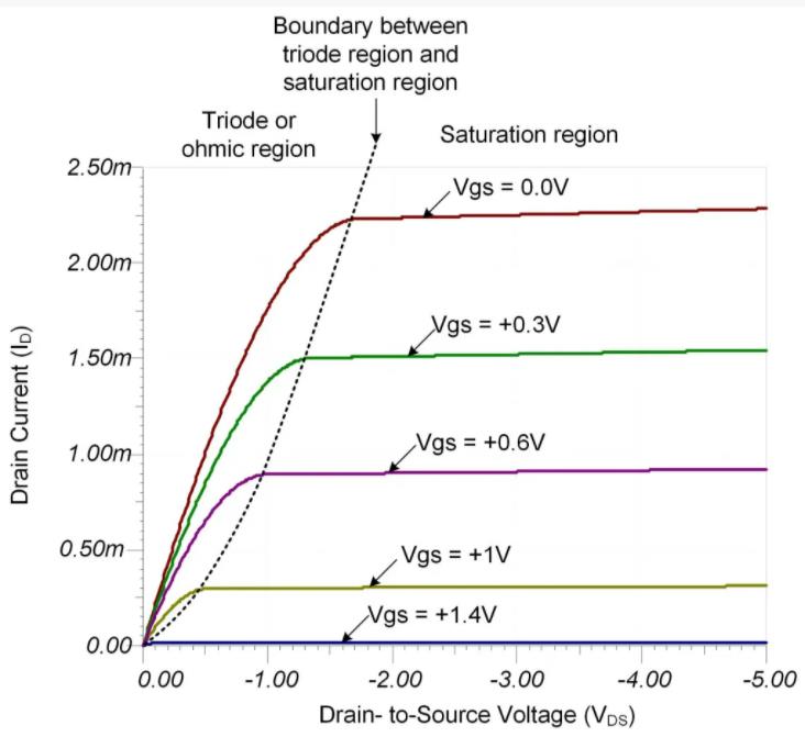 對于較高的V DS,通道擠出了,晶體管據(jù)說位于飽和區(qū)域。在飽和區(qū)域中,通過晶體管的電流相對恒定,對于各種排水到源電壓(請參見圖5的右側(cè))。