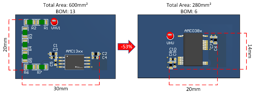 電流分立式高壓電阻會占用 PCB 上的大部分空間。通常,單個電阻的壓降受限于制造商,由于板級可靠性問題,客戶傾向于選擇尺寸較小的電阻。因此,系統(tǒng)可能需要多達 15 個高壓電阻來降低電壓并維持系統(tǒng)的隔離額定值。相比之下,AMC038x 產(chǎn)品系列將高壓電阻集成到器件中,相當(dāng)于使設(shè)計更簡單、更小巧。這在高壓輸入和下一個最近的引腳之間提供了 8mm 爬電距離和間隙距離。如圖 1 所示,設(shè)計尺寸減小了 50% 以上,并大大減少了 BOM 數(shù)量。
