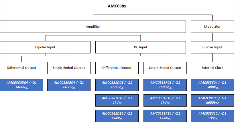 AM038x 器件器具有四個固定比率選項,可提供四個不同的輸入電壓范圍:400V、600V、1000V 和 1600V。這些器件還具有三種不同的輸出類型:差分模擬輸出、單端模擬輸出和數(shù)字位流調(diào)制器輸出(圖 8)。這些器件通過雙極輸入選項(表 1)支持交流電壓檢測,通過直流輸入選項(表 2)支持直流電壓檢測。