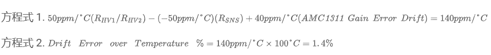 一些應(yīng)用也可以考慮添加外部電阻來手動調(diào)整內(nèi)部電阻分壓器的增益。這是可行的;但需要注意的是,這會重新引入在使用集成電阻器件時幾乎可以避免的溫度漂移和增益誤差。借助集成電阻,高壓和低壓電阻的增益漂移可以朝同一方向漂移,并在溫度范圍內(nèi)保持穩(wěn)定,實際微乎其微。當(dāng)引入一個外部電阻 REXT 時,在最壞情況下,內(nèi)部電阻和 REXT 的增益漂移會朝相反方向變化并對系統(tǒng)增加二次誤差。例如,如果用戶希望在 1000V 器件上檢測 1200V 電壓,該用戶可以考慮以下演示: