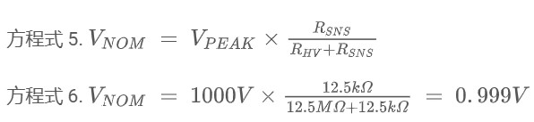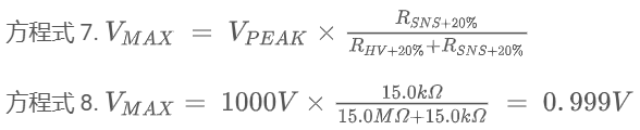 對于 1000V 器件:RHV = 12.5MΩ;RSNS = 12.5kΩ。集成電阻容差為 ±20%。高壓和低壓電阻 RHV 和 RSNS 朝相同方向漂移。SNSP 引腳上的標(biāo)稱電阻分壓器電壓: