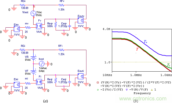 其中的Zf和Zr分別是從信號注入點正向和反向看過去的阻抗。舉例來說,在圖11a所示的電路中,Zf=rn=25Ω,Zr=RG||RF=125Ω,這就確認了在直流時(1+400)/(1+2000)≅25/125。顯然,對rn=RG||RF(本例中為125Ω)來說,求和節(jié)點處的電流和電壓反饋剛好是50對50(通過設定Ti=Tv=400,PSpice可以確認這點)。