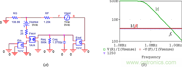 圖11a顯示了本例要求的測試電路。圖11b表明,T的構成中確實包含了電流和電壓分量,但主要是電流分量,因為與Tv相比,T更接近于Ti。因此,在rn≠0的條件下精心設計的電流反饋放大器在其求和節(jié)點主要呈現電壓反饋(更不用說完全呈電壓反饋了)的說法顯然是錯誤的。在我們的例子中,光標測量給出的直流值是Ti0≅400,Tv0≅2000,T0=333.3,完全滿足公式(11a)。再次運行相同的電路,但將rn從25Ω降低到0.025Ω以仿真趨于理想的輸入緩沖器,可以得到Tv0≅2x106,T0≅Ti0=333.33,這種情形幾乎完全是電流反饋。事實上,由于1/(1+2x106)+1/(1+333)≅1/(1+333),在這種情況下我們可以跳過電壓注入測試,只進行電流注入測試來節(jié)省時間和工作量。