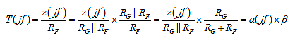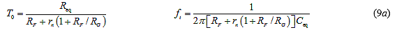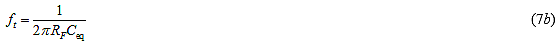 • 隨著頻率的提高,Ceq開始起作用,造成|z(jf)|隨著頻率發(fā)生滾降,直到達到頻率點ft,在該頻率點|z(jft)|=RF,或者忽略Req,(2πftCeq)-1=RF。求解ft得到: