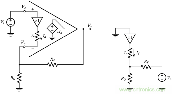 上述分析是假設使用理想的緩沖器,但實際上緩沖器具有一定的局限性。影響電流反饋放大器工作最主要的因素是輸入緩沖器的非零輸出阻抗,這個阻抗我們在圖9a中用電阻rn進行了建模。下面將通過rn進行擴展分析,記住,新的結果必須在rn→0時匹配上述結果。(實際上rn不必達到0,它只需小到產生的效應可以忽略即可。)