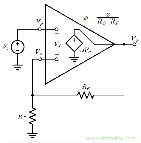 令Vn=Vp=Vi,將In代入公式(1),然后進行歸集,就能巧妙地表達閉環(huán)增益A: