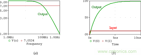 下面使用圖6所示的電路來驗證針對單位交流電壓的閉環(huán)響應,并且(在用單位電壓步距代替輸入源之后)驗證瞬態(tài)響應。響應結果如圖7所示。光標測量表明,交流響應峰值在9.975V(而不是理想的10.0V)。這與公式(2)預測的約–1/T0(=–1/400或–0.25%)的誤差一致。此外,交流響應在ft(=100MHz)時下降到一半的功率值。