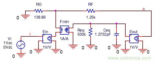 將上述誤差以物理的方式顯示出來是一件有意思的事:為了維持Vo=9.975V,反射鏡必須給Req提供9.975/(500x103≅20µA的電流。通過反射鏡動作,這個電流必須與In相符,表明圖2a所示的由RF抽取的電流和由RG抽取的電流之間存在20uA的失衡。具體地說,RF抽取的電流要比RG小20uA,因此當RG下降1.0V時,RF將下降9.0-1.25x103x20x10-6=9.0-0.025V=8.975V。最終KVL確認Vo=1.0+8.975=9.975V或-25mV的誤差。