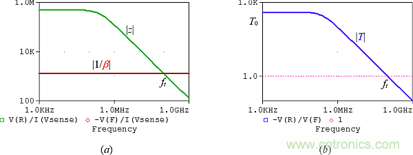參考圖5,我們使用光標測量方法證實直流跨導增益等于Req(500k V/A),|1/β|等于RF(1.25k V/A),因此直流環(huán)路增益是T0=500/1.25=400,這與光標測量結果是一致的。|z|和|1/β|曲線在100MHz點相交,這個點也是|T|下降到單位1的頻率。這個頻率與通過公式(7b)計算得到的ft是一致的。